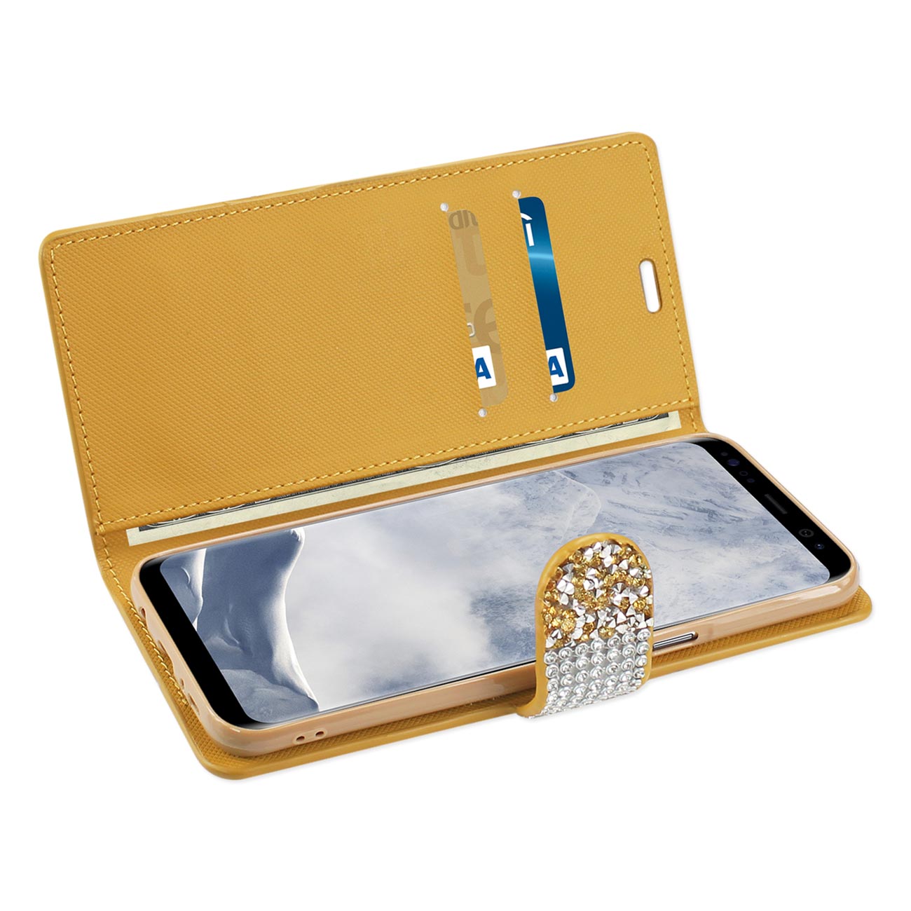 Beautiful jewelry rhinestone wallet case. Built In side pockets for credit cards, business cards and other daily must-have items. Secure magnetic flap to keep case closed and your phone scratch-free. Snug fitting holds your phone firmly. Wallet case covers your phone entirely. Well cutout ports for your earbuds or headphones and USB charging cable. This phone model is also known as SAMSUNG GALAXY S8 EDGE/ S8 PLUS SM-G955.